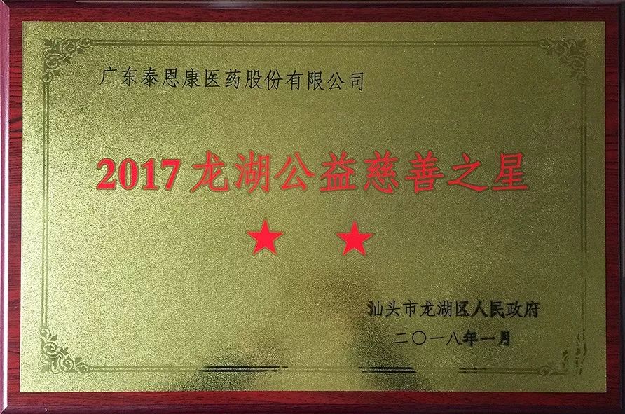 據(jù)了解,此次接受授牌共有17家企業(yè)。其中,廣東泰恩康醫(yī)藥股份有限公司等7家企業(yè)及個人被授予“龍湖公益慈善之星”二星榮譽。