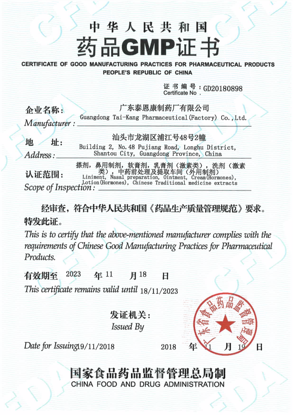 11月18日,廣東泰恩康制藥廠(chǎng)有限公司通過(guò)國(guó)家GMP認(rèn)證,拿到GMP證書(shū)。