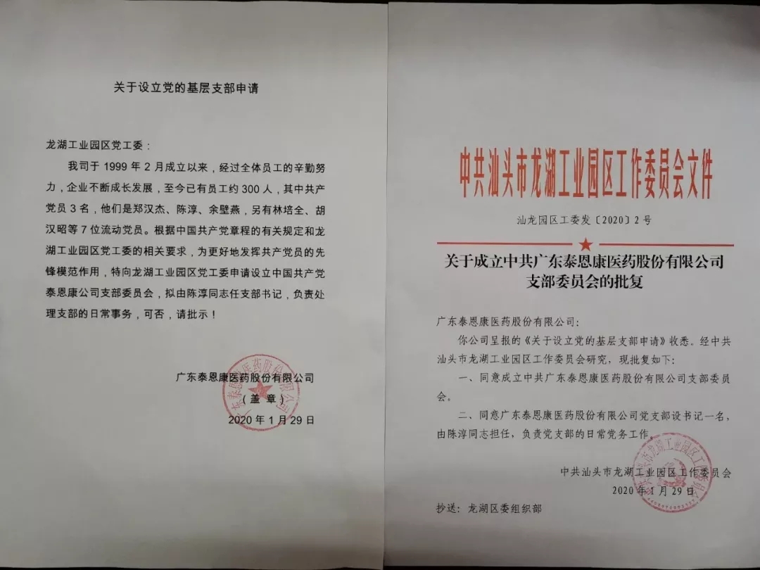 面對來勢洶洶的疫情,為打贏疫情防控狙擊戰(zhàn),廣東泰恩康醫(yī)藥股份有限公司(以下簡稱“泰恩康”)作為國內(nèi)醫(yī)用器械產(chǎn)品的品牌生產(chǎn)企業(yè),2020年1月29日,火速向龍湖工業(yè)園區(qū)黨工委申請成立黨支部,確保把黨支部建立在疫情防控最前線。