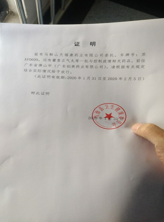 藥品運輸途中,由于疫情的不斷發(fā)展,各地交通開始實行交通管制,車輛通過需要貨物發(fā)出地政府或衛(wèi)健委部門開具相關(guān)證明。情急之下,張華書記聯(lián)系運輸人員打聽手續(xù)事宜,最后聯(lián)系到當(dāng)涂經(jīng)濟開發(fā)區(qū)分管領(lǐng)導(dǎo),說明運輸藥品為抗疫急需物資,當(dāng)涂經(jīng)濟開發(fā)區(qū)分管領(lǐng)導(dǎo)了解清楚情況后當(dāng)即答應(yīng)協(xié)調(diào)防疫指揮部和衛(wèi)健委開辦通行證明。
