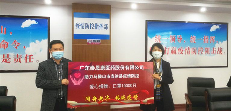 肺炎疫情一直牽動(dòng)著人心,疫情無情人有情。2020年3月25日上午,受鄭漢杰董事長(zhǎng)的委派,安徽泰恩康制藥有限公司(原馬鞍山天福康藥業(yè)有限公司)總經(jīng)理羅億華代表廣東泰恩康醫(yī)藥股份有限公司向當(dāng)涂縣疫情防控指揮部捐贈(zèng)一次性醫(yī)用口罩10000只,用于當(dāng)涂縣疫情防控工作,副縣長(zhǎng)袁敏親自出席,并聽取了企業(yè)醫(yī)用口罩生產(chǎn)線的建設(shè)投產(chǎn)進(jìn)度,鼓勵(lì)企業(yè)加快進(jìn)度,政府將全力支持!