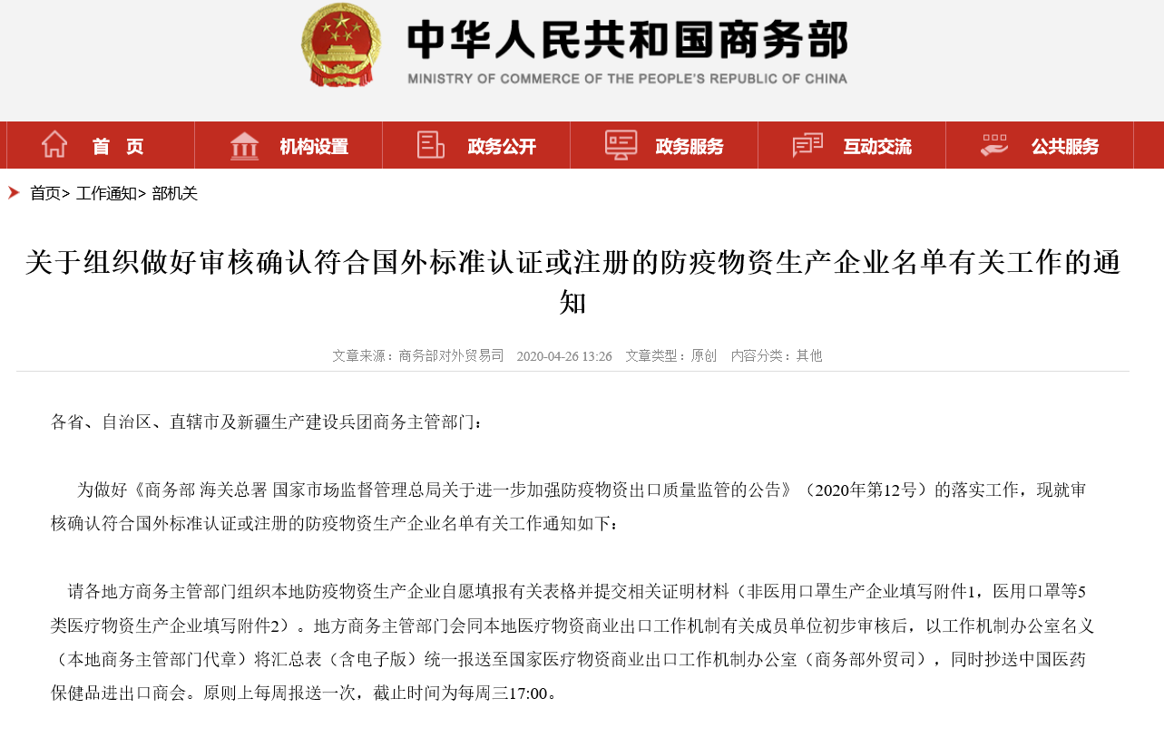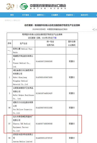 4月25日,商務(wù)部會(huì)同海關(guān)總署和國家市場(chǎng)監(jiān)督管理總局,三部門聯(lián)合發(fā)布2020年第12號(hào)公告,緊急宣布進(jìn)一步加強(qiáng)防疫物資出口質(zhì)量監(jiān)管,加強(qiáng)非醫(yī)用口罩出口質(zhì)量監(jiān)管,自4月26日起,出口的非醫(yī)用口罩應(yīng)當(dāng)符合中國質(zhì)量標(biāo)準(zhǔn)或國外質(zhì)量標(biāo)準(zhǔn)。隨后,商務(wù)部發(fā)布通知:防疫物資生產(chǎn)企業(yè)可以向本地商務(wù)局申請(qǐng)加入商務(wù)部白名單,并提交相關(guān)表格和證明材料。在公布發(fā)出后,泰恩康第一時(shí)間做出反應(yīng)遞交申請(qǐng)材料,5月8日,泰恩康成功進(jìn)入中國商務(wù)部口罩CE出口白名單。