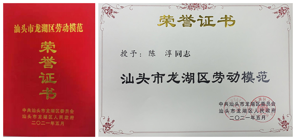 泰恩康副總經(jīng)理陳淳在汕頭市龍湖區(qū)開展的創(chuàng)文活動、抗擊新冠疫情工作中,發(fā)揮了先進典型的示范引領(lǐng)作用,在疫情發(fā)生時迅速指導成立專項小組,指導泰恩康生產(chǎn)部投入生產(chǎn),抗擊疫情;帶領(lǐng)泰恩康黨員進行各種響應上級黨委號召的活動,加強黨員黨性修養(yǎng),不忘初心、牢記使命、真抓實干,榮獲汕頭市龍湖區(qū)頒發(fā)的“勞動模范"稱號。