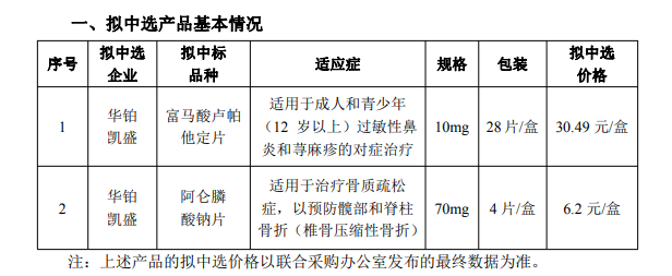 10月28日,《全國(guó)藥品集中采購(gòu)擬中選結(jié)果公示》正式發(fā)布。泰恩康旗下全資子公司山東華鉑凱盛生物科技有限公司參與投標(biāo)的富馬酸盧帕他定片和阿侖膦酸鈉片兩款產(chǎn)品成功擬中選,采購(gòu)周期為三年。